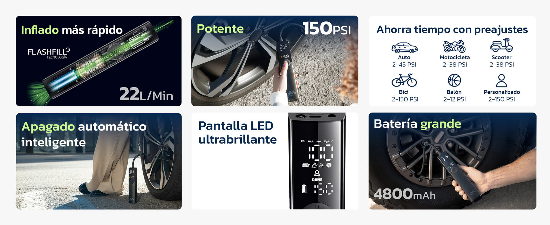 Inflado rápido en 1 minuto, lo suficientemente potente para camionetas, y lo bastante compacta para cualquier emergencia.