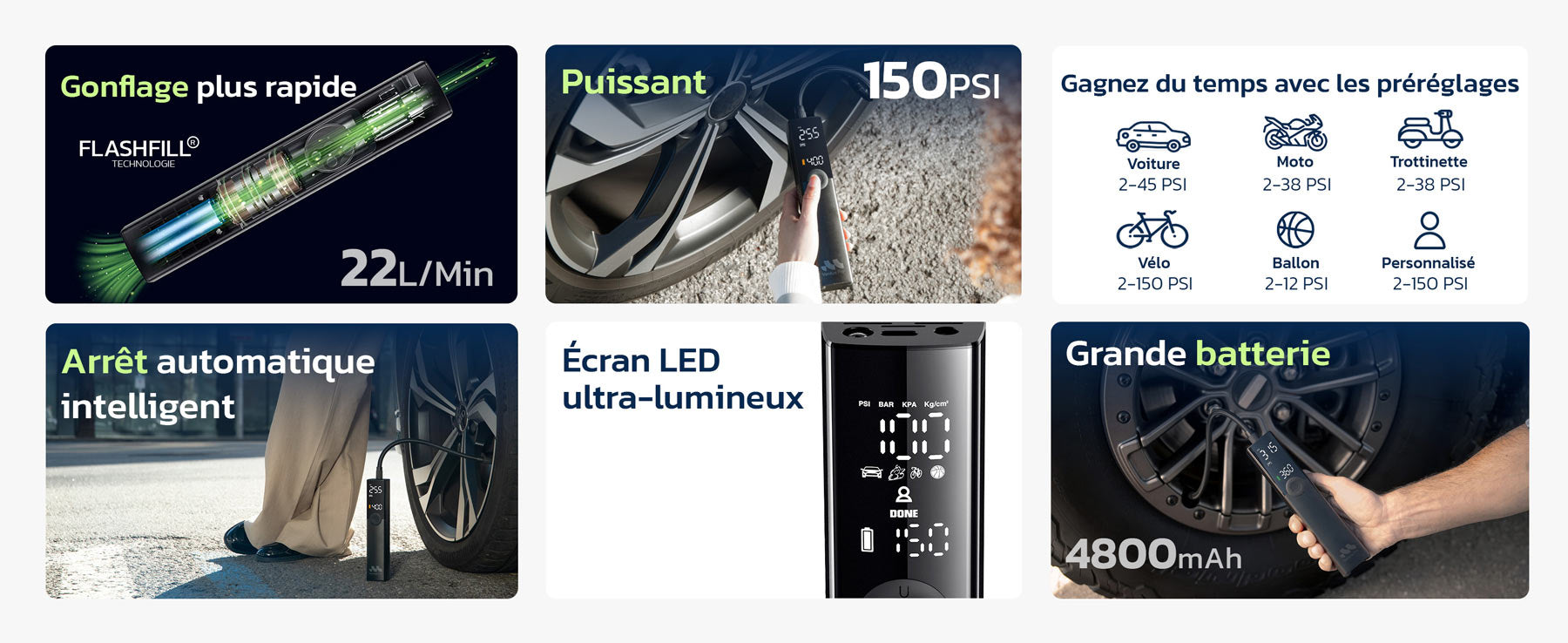 Gonflage ultra-rapide en 1 minute, assez puissant pour les pick-up, tout en restant compact – prêt pour toutes les urgences.