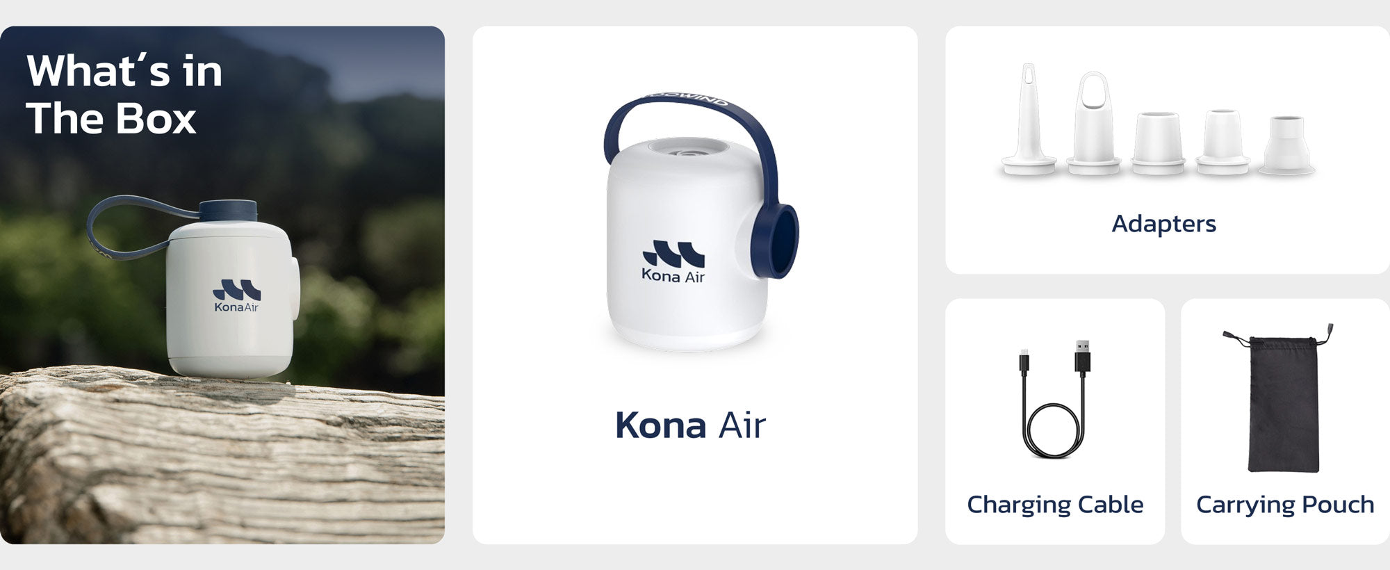 Ultra-compact yet powerful, the Kona Air Mini Mattress Pump quickly inflates and deflates your air mattress anytime, anywhere. Lightweight, portable, and USB rechargeable — perfect for camping, travel, or pool fun.
